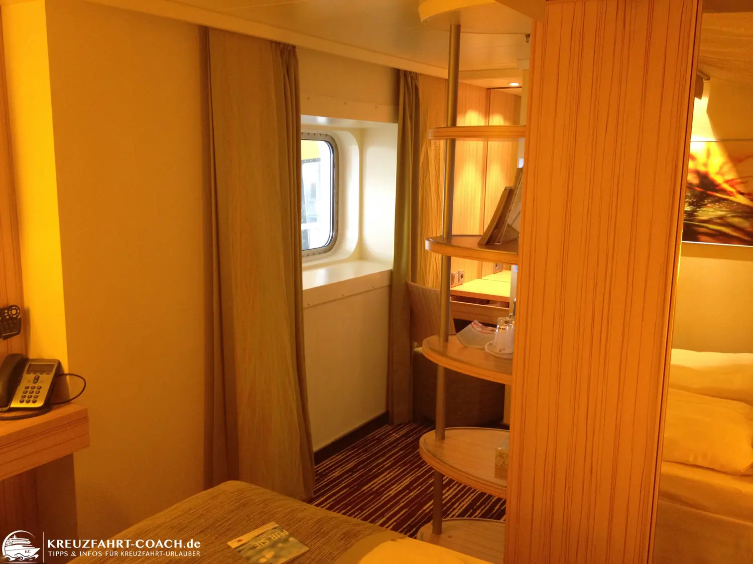 Meerblickkabinen sind etwas größer als die Innenkabinen. Die Raumaufteilung hat uns allerdings nicht so gut gefallen. Wenn man hereinkommt, war links um die Ecke das Bett (Bilder siehe unten). Vor allem der Durchgang neben dem Bett an der Außenwand ist sehr schmal. In den Innenkabinen konnte ich da bisher immer gut meinen Koffer unterbringen. Das war hier nicht möglich. Aber das dürfte für die meisten wohl kein Thema sein.