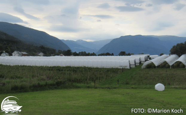 Zum Landschaftsbild von Vik i Sogn gehört die Schafzucht, aber auch der Anbau von Beeren. Gewächshäuser, Himbeeren und Erdbeerfelder sind an den Hängen weithin sichtbar. Die Sommer sind kühler, deswegen reifen die Beeren später als bei uns und man kann Ende August noch Früchte ernten.